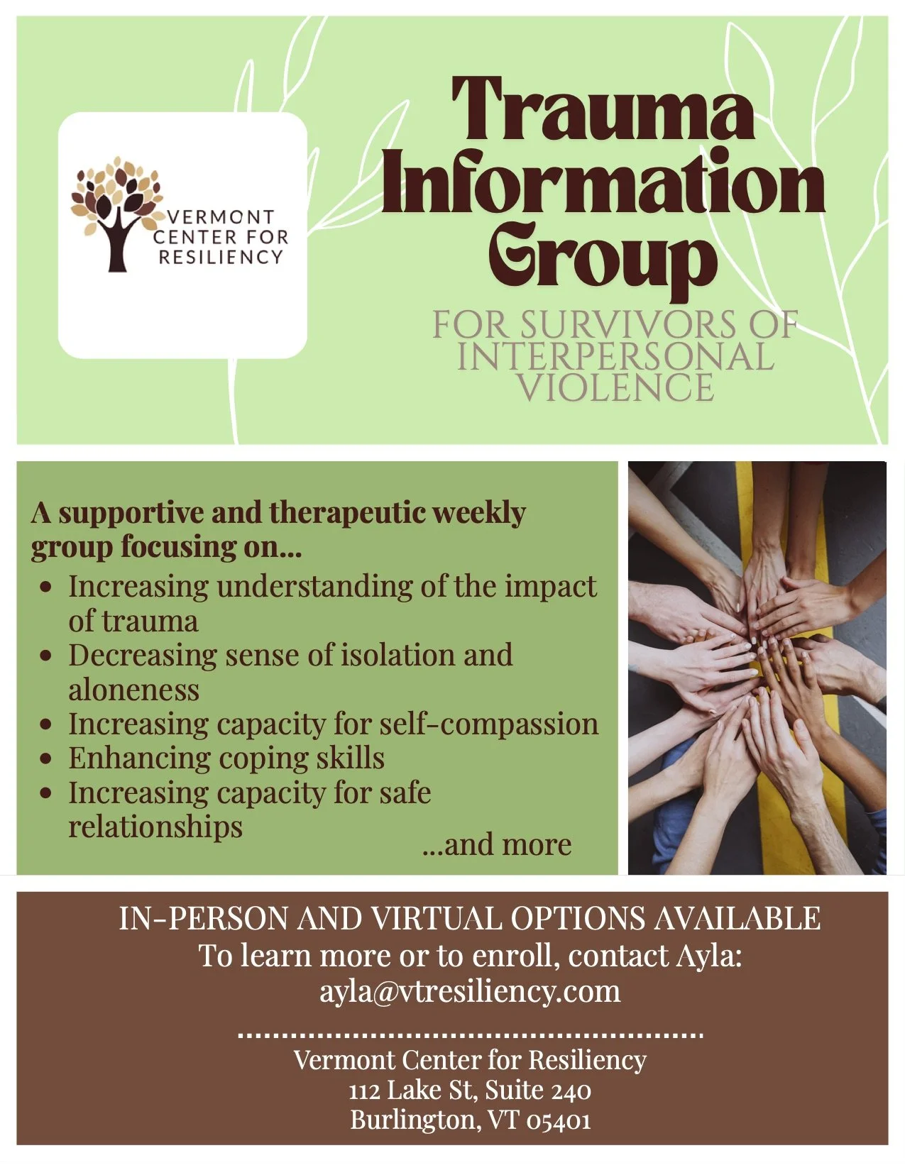 Contact Ayla at ayla@vtresiliency.com or (802) 242-1561 to schedule an intake appointment